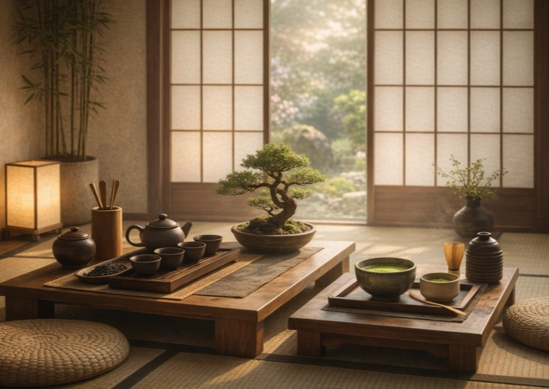 Die japanische Teezeremonie ist stark vom Zen-Buddhismus beeinflusst. Sie basiert auf festen Regeln und Bewegungsabläufen und folgt ästhetischen Prinzipien wie Schlichtheit, Harmonie und Vergänglichkeit.