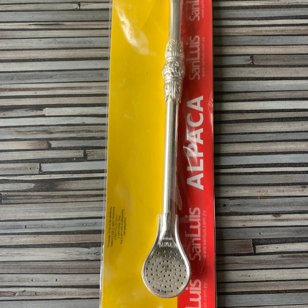 Die Bombilla (Trinkhalm) ist aus einem Stück aus Alpaca Silber. Sie misst 19 cm, hat ein langes Mundstück und wird kaum heiß, ist daher ideal um heiße Mate zu trinken, oder auch kalt als Tereré. Auffällige, verdicktes Verzierung.