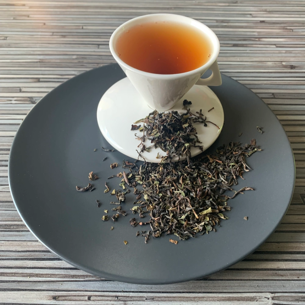 Die Blattgradierung FTGFOP1 – Finest Tippy Golden Flowery Orange Pekoe steht für eine besonders feine Auslese junger Blätter mit sichtbaren Tips. Das Blattbild ist eher klein, fein gearbeitet und dunkel, durchzogen von einzelnen helleren und leicht grünlichen Blattspitzen. Diese sorgfältige Verarbeitung bildet die Grundlage für die klare, helle Tasse und den differenzierten Geschmack dieses hochwertigen Schwarztees.