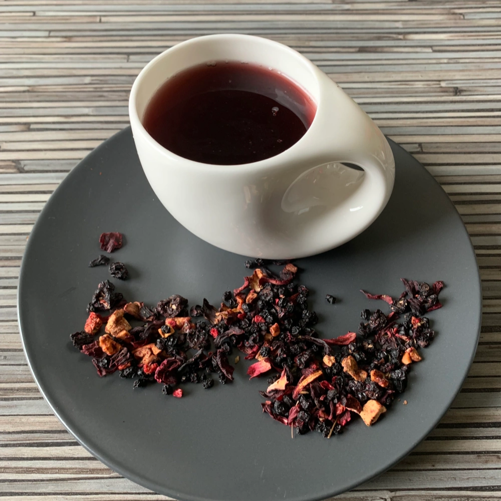Fliederbeeren, Hibiskusblüten, Apfelstücke, schwarze Johannisbeeren, Aroma, gefr.-getr. ganze Brombeeren, gefr.-getr. Erdbeer- und Himbeerstücke, Walderdbeerblätter