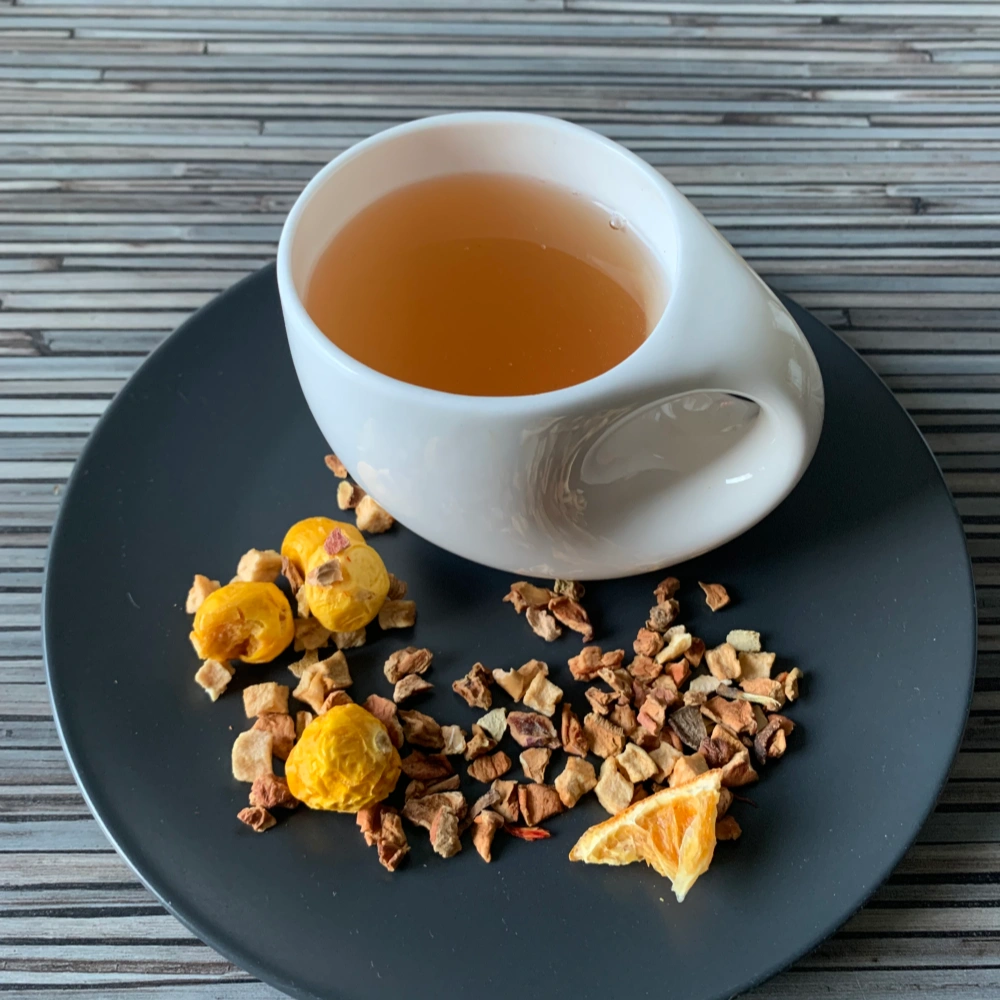 Im Mittelpunkt steht die Physalis, die mit ihrer feinen Säure perfekt mit der spritzigen Orange harmoniert. Apfelstücke sorgen für eine milde, runde Basis, während Orangenschalen und -spalten Frische und Fruchtigkeit in die Tasse bringen. Färberdisteln unterstreichen die strahlend gelbe Farbe des Aufgusses.
