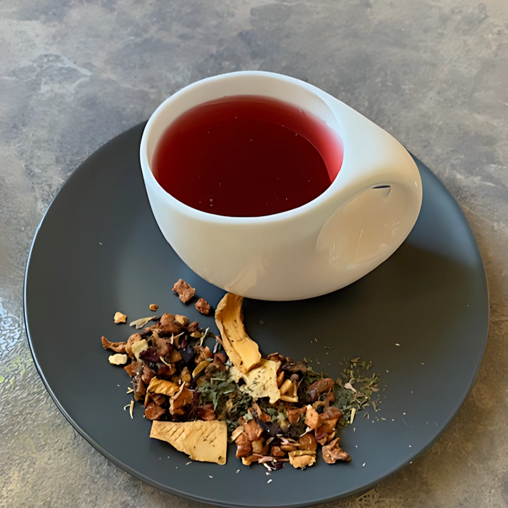 Saftige Blutorange, exotische Mango und aromatische Maracuja bilden das Herz dieser Komposition. Die fruchtige Basis wird von Apfelstücken getragen, während Hibiskus und Rote Bete für Tiefe und eine leuchtende Tassenfarbe sorgen.