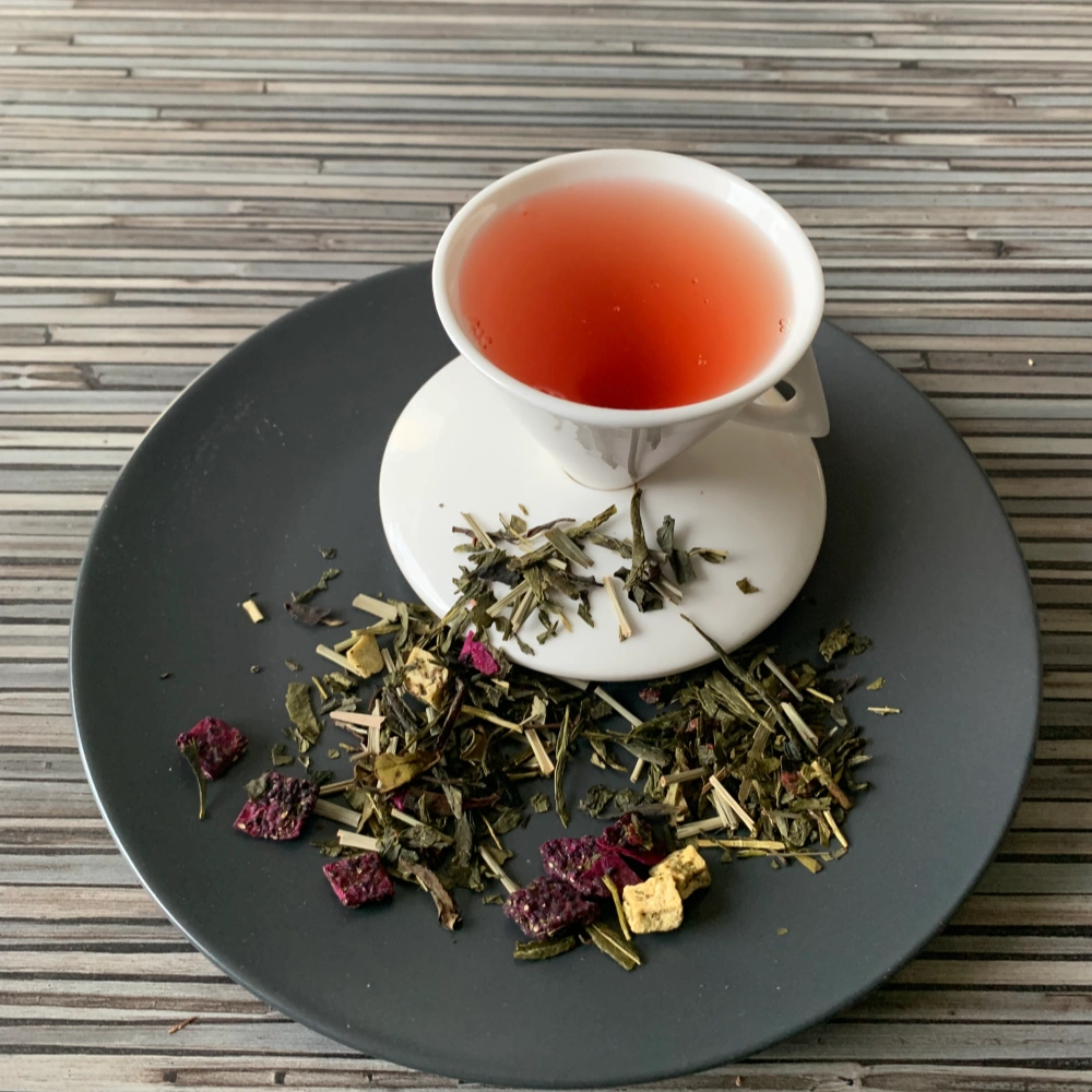 Die Basis dieser edlen Mischung bilden kräftiger grüner Sencha, feiner Kukicha sowie eleganter weißer Tee Pai Mu Tan. Diese ausgewogene Grün-Weißteebasis schafft Raum für die fruchtigen und floralen Komponenten und sorgt für eine klare, zugleich sanfte Struktur in der Tasse.