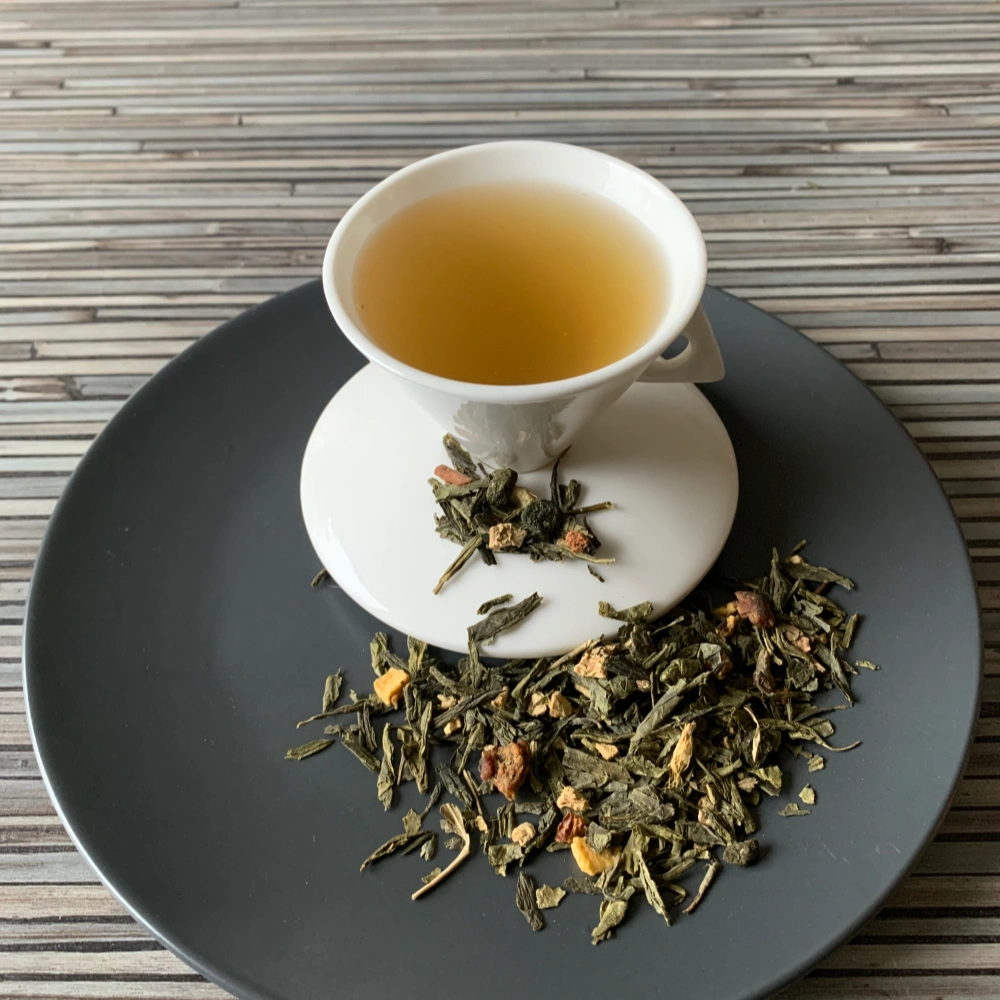 Fruchtstücke, feine Grünteeblätter und sorgfältig ausgewählte Zutaten ergeben ein ausgewogenes, hochwertiges Gesamtbild. Die Mischung wirkt klar, lebendig und zugleich wohltuend. Bereits das trockene Blatt zeigt die Vielfalt dieser Komposition – natürlich, farbenfroh und einladend.