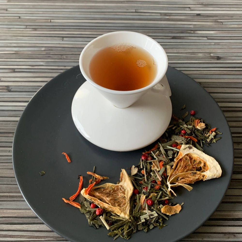 Die Basis dieser Mischung bilden sorgfältig ausgewählte grüne und schwarze Tees. Der grüne Tee sorgt für Frische und Leichtigkeit, während der schwarze Tee Tiefe und Struktur verleiht. Gemeinsam schaffen sie ein ausgewogenes Fundament, das die kräftigen Frucht- und Gewürznoten sicher trägt.
