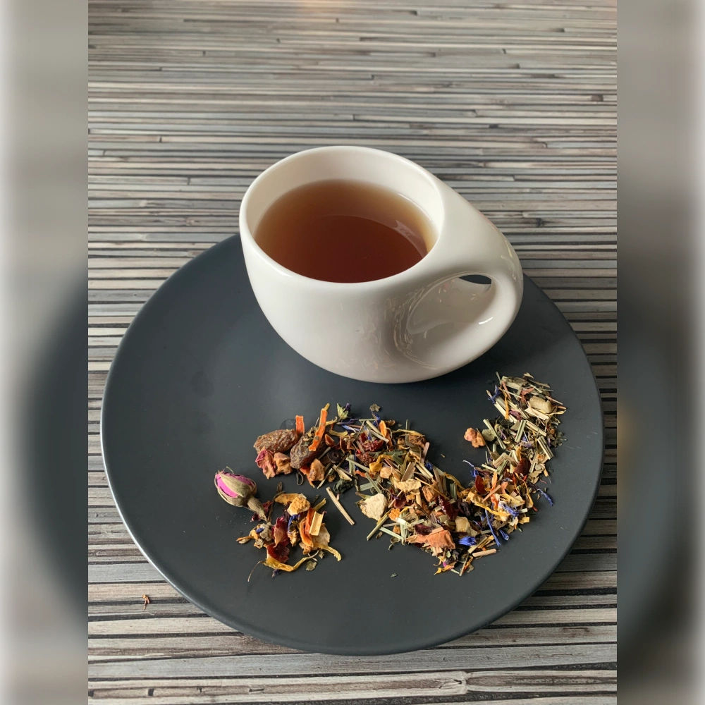 Hagebuttenschalen, Hibiskusblüten und Orangenschalen verleihen Tiefe und Farbe. Karottenraspeln, Brennnesselblätter und süße Brombeerblätter ergänzen die Mischung mit pflanzlicher Ausgewogenheit. Blüten wie Kornblume, Malve, Ringelblume, Rose und Färberdistel machen diesen Kräutertee nicht nur geschmacklich, sondern auch optisch besonders hochwertig.