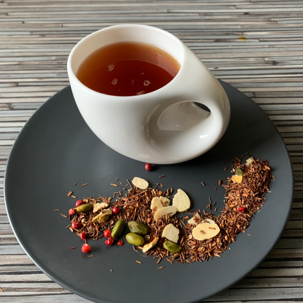 Rotbuschtee, gehobelte Mandeln, Pistazien, Orangenschalen, Koriander, Aroma, rosa Pfefferkörner