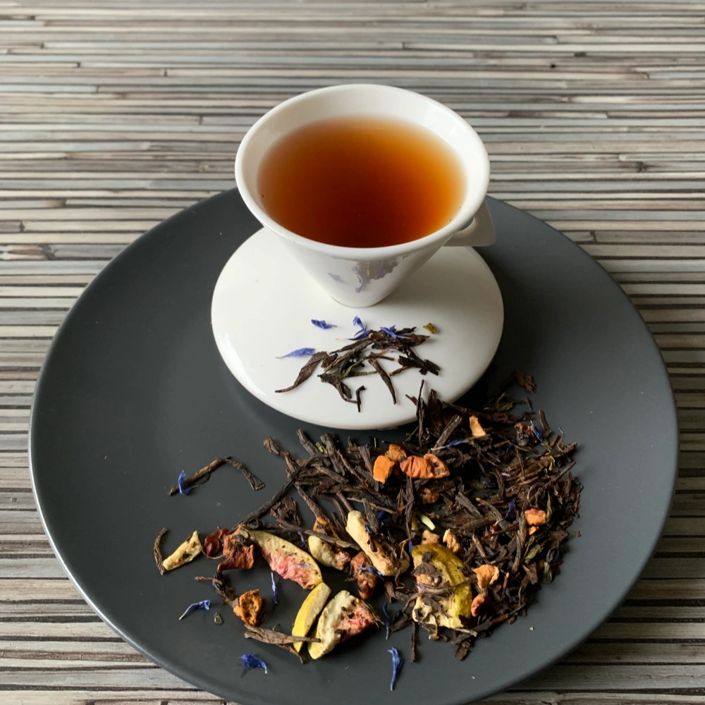 Schwarzer Tee (56 %) Black Sencha, Apfelstücke, schwarzer Tee (10 %), gefr.-getr. Feigenviertel, grüner Tee (5 %) Sencha, Aroma, blaue Kornblumenblüten