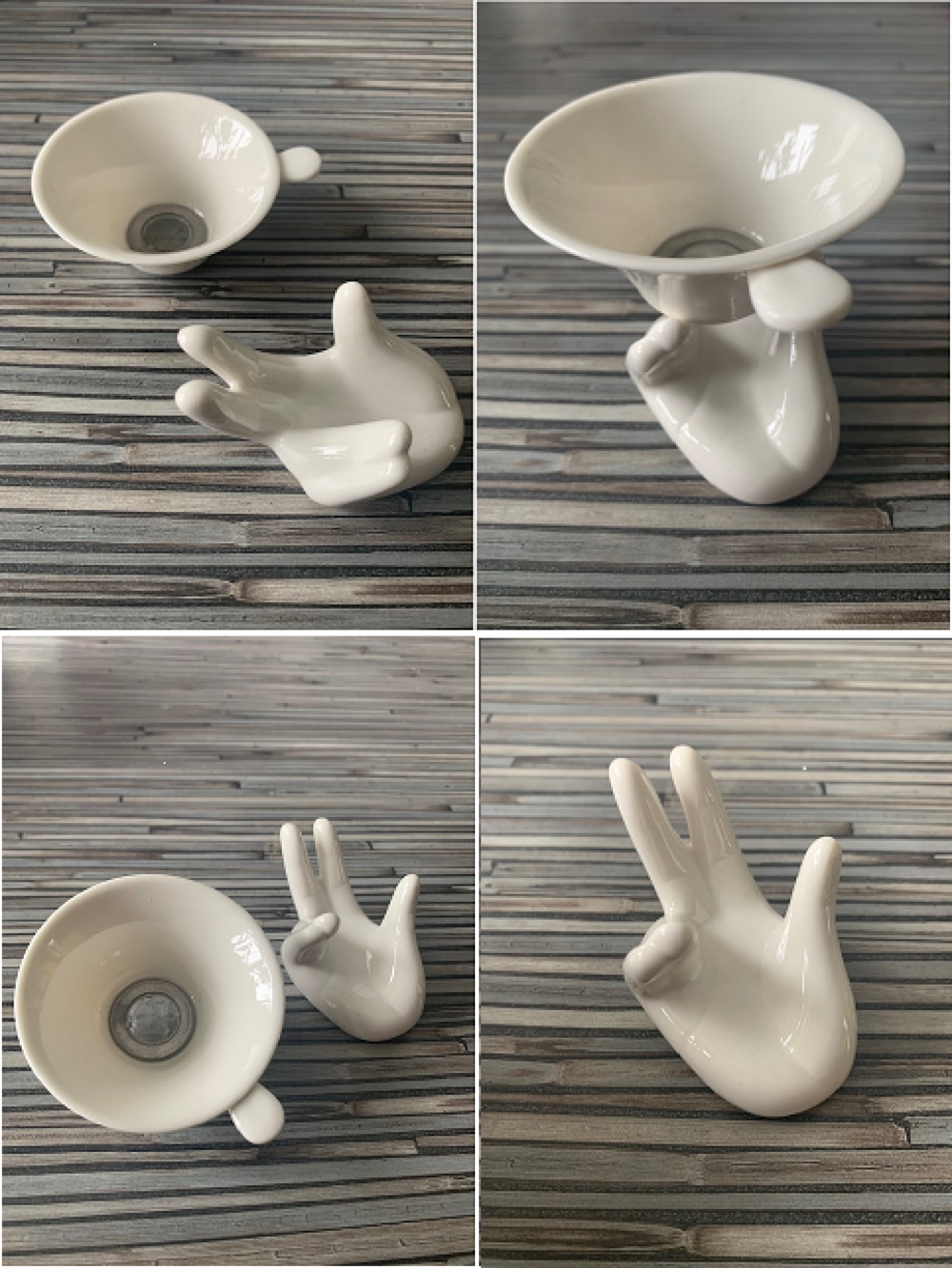 Der Filter hat einen Durchmesser von 7 cm und ist aus feinstem, weißen Porzellan gefertigt, mit einem schönen Haltegriff, um ihn einfach aus der Teetasse zu nehmen. Der Siebeinsatz am Boden des Siebs ist aus Edelstahl. Man kann es einfach reinigen. Sehr feinmaschig somit für jeglichen Tee geeignet. Der Halter des Siebs hat die Form einer nach oben gehaltenen Hand und ist ebenfalls aus feinstem Porzellan hergestellt. Sie hat eine Höhe von 5 cm und ist 8 cm breit.
